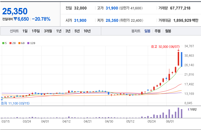 두산중공업의 6월 7일 기준 종가는 32,000원으로 52주 신고가를 기록하였지만 8일 20.78%가 급락하며 25,350원에 마감을 하였습니다.