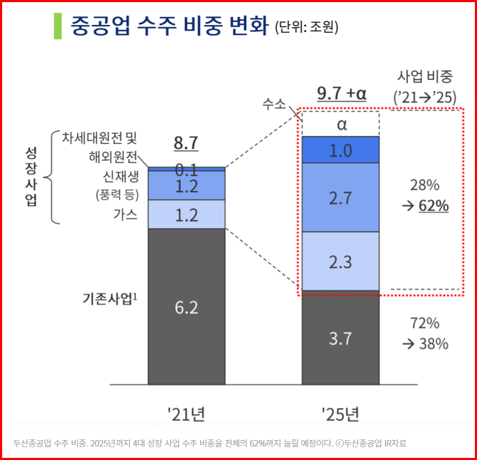 두산중공업은 2025년까지 4대 성장 사업(SMR, 해상풍력, 가스터빈, 수소) 수주 비중을 전체의 62%까지 늘릴 예정이라고 합니다.