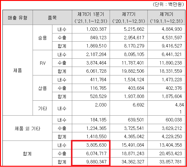 2020년 12월 기준 기업의 매출 구성을 보면 세단 차량이 23%, RV 차량의 매출이 58%이니 기업의 실적에 가장 큰 기여를 하는 것은 카니발, 쏘렌토 같은 RV 차량이라 볼 수 있겠습니다.