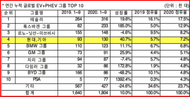 2020년 기준 글로벌 EV 그룹 순위를 보면 현대, 기아가 4위에 위치한 모습입니다.
