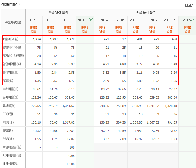 2018년 기준 매출액은 1,874억 원, 2019년 1,897억 원, 2020년 기준 1,978억 원입니다. 영업이익과 당기순이익 또한 꾸준하게 증가하는 모습이 보입니다. 2020년 12월 전년 동기 대비 연결기준 매출액은 4.2% 정도 증가하였고, 영업이익 또한 40% 증가한 모습을 보여주고 있습니다.